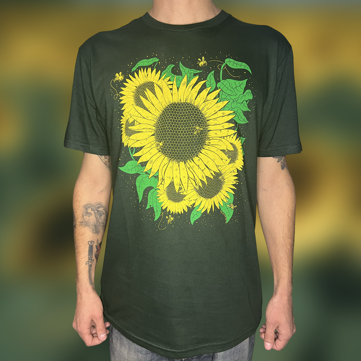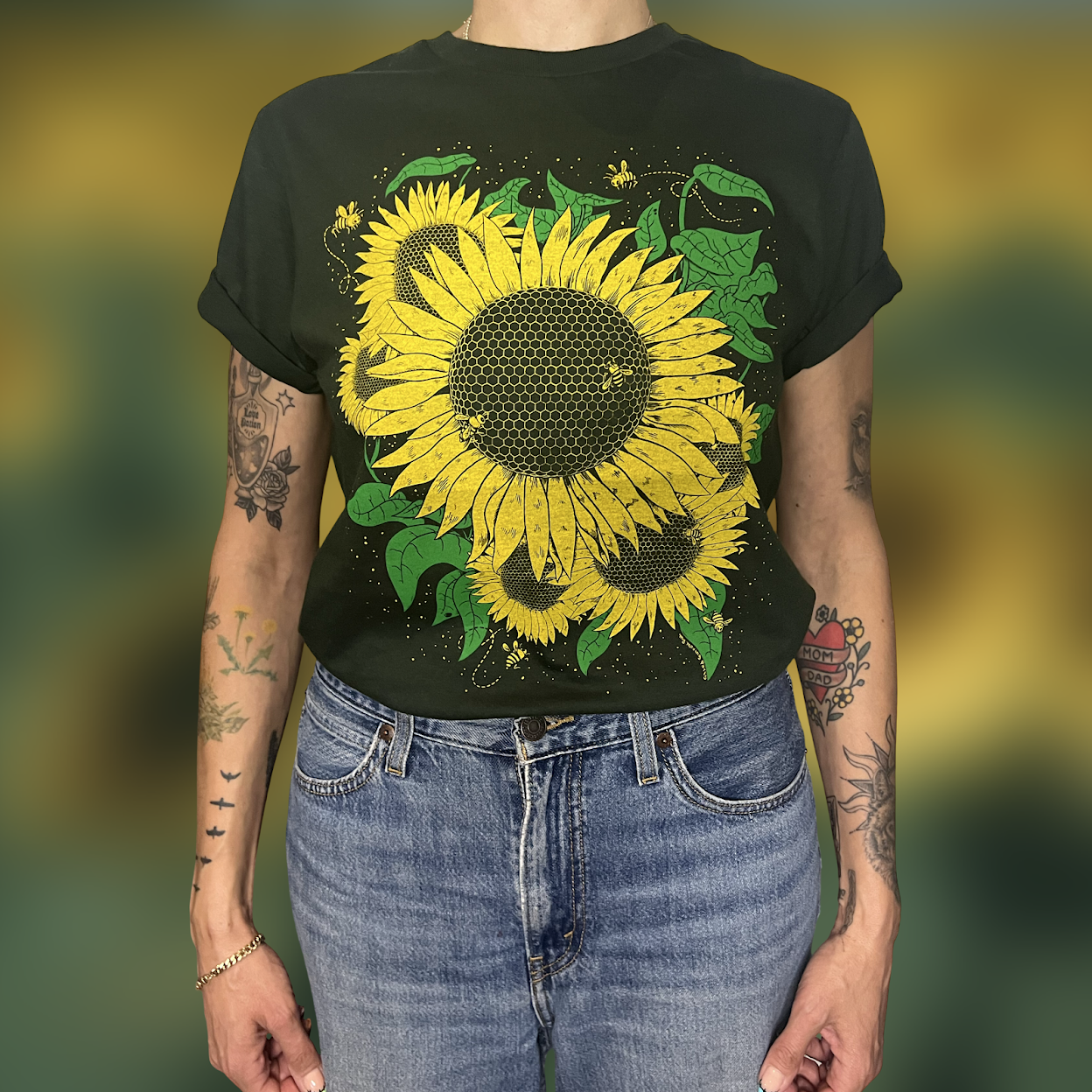 Rooted in nature and made to feel like an old favorite, the Sun-Kissed Hive tee is all about connection between blooms and bees, between people and the earth. Printed on a soft, 100% cotton hunter green shirt, this design features hand-drawn sunflowers with warm honeycomb centers and bees gently circling, captured mid-flight.